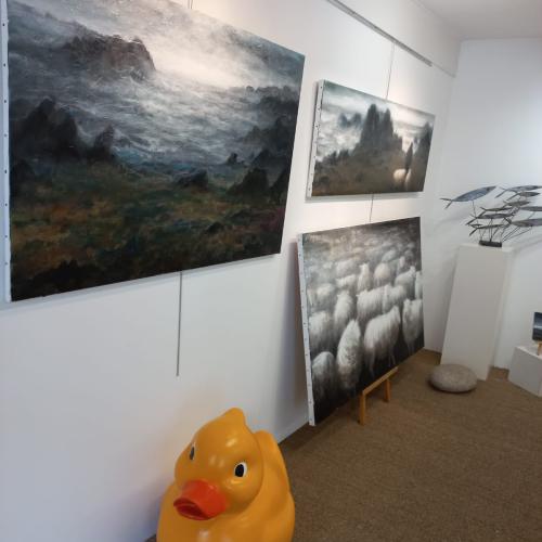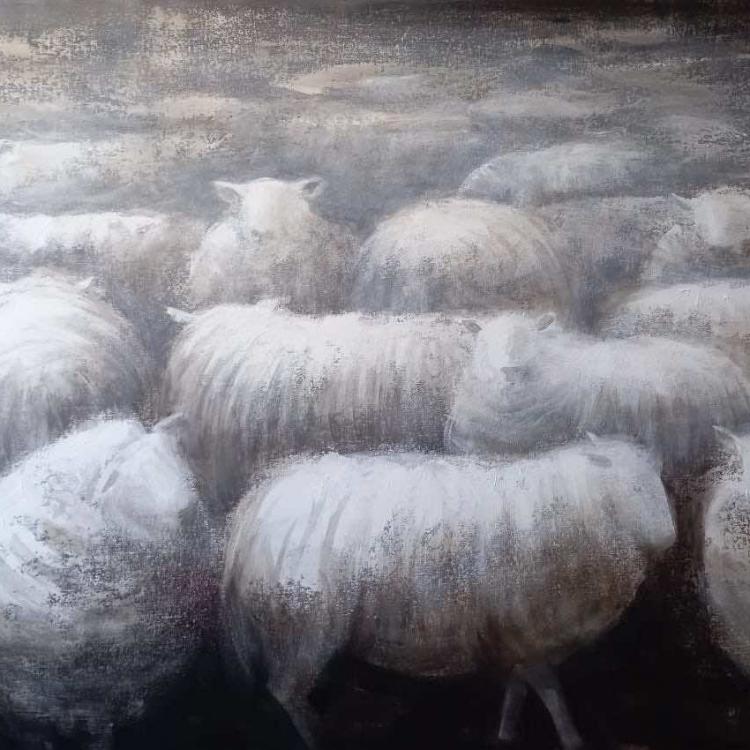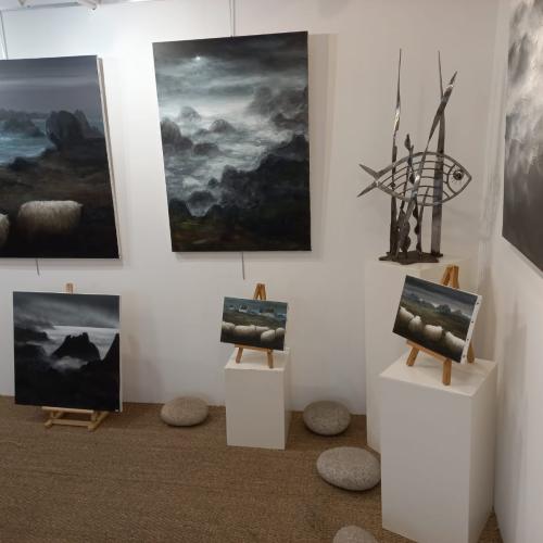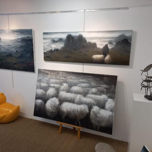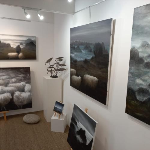 ...Ouessant et ses paysages d’hiver, la tempête, la brume, le crépuscule représentés dans les toiles dégagent une ambiance mystérieuse et unique propre à cette ile du bout du monde.......Troupeau de moutons déambulant tels des nuages et brumes de mer, un contraste de douceurs face aux paysages lunaires et tempétueux de l’ile....
